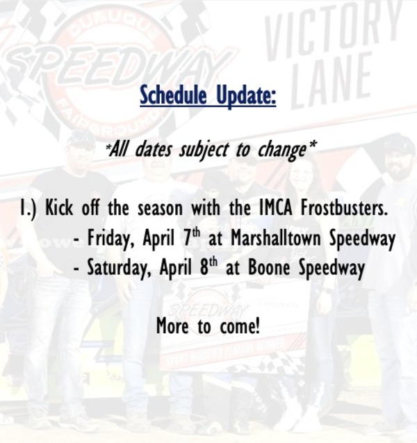 As of now our first race(s) are the IMCA Frostbuster - just over one month away!!